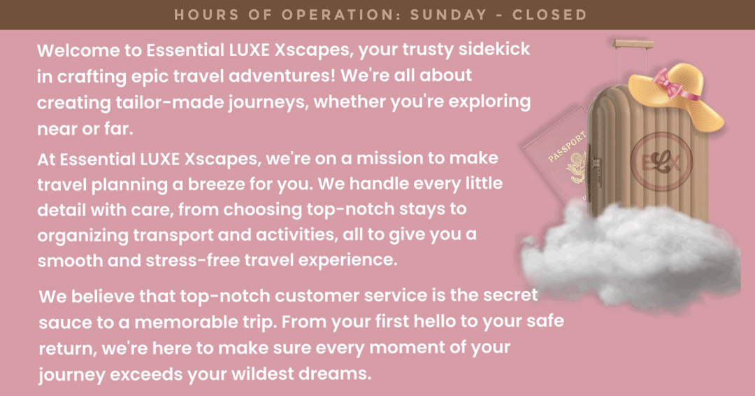 We want to hear all about your adventures with Essential LUXE Xscapes! Share your experience working with us and let others know about the unforgettable moments, the amazing destinations, and the exceptional service you received. Your stories will inspire others to embark on their own extraordinary journeys with us. So don't hold back - spill the beans and let the good times roll!"